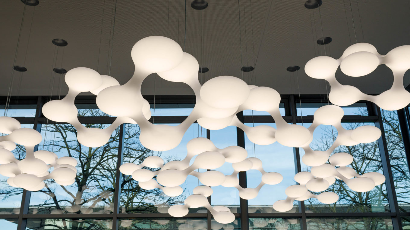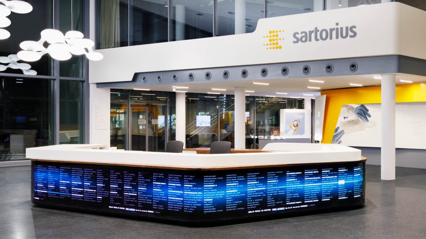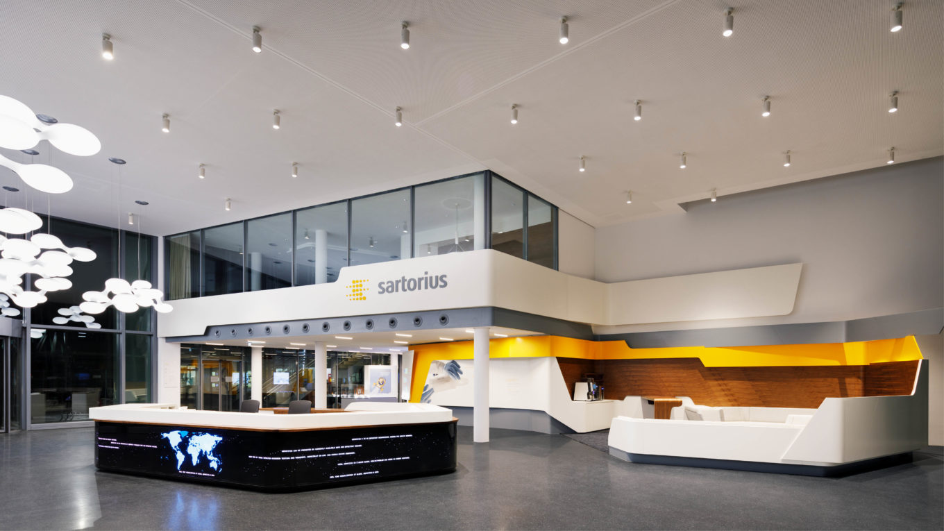 Der Sartorius Konzern ist ein international führender Partner der biopharmazeutischen Industrie und der Forschungsbranche. Für den Sartorius Campus Göttingen inszenierte Matthias Kaminsky als Creative Director von FTWild die neue gläserne Eingangshalle. Ein Ufo-förmiger Empfangstresen, der rundum aus LEDs besteht und in Echtzeit medial mit den Themen der weltweiten Filialen von Sartorius inszeniert werden kann. Besucher des Unternehmens erwartet im Foyer eine futuristische Lounge. Mit 21 Cosmo-Leuchten von Next wurde die Decke der Eingangshalle in ein atemberaubendes Lichtermeer verwandelt.
