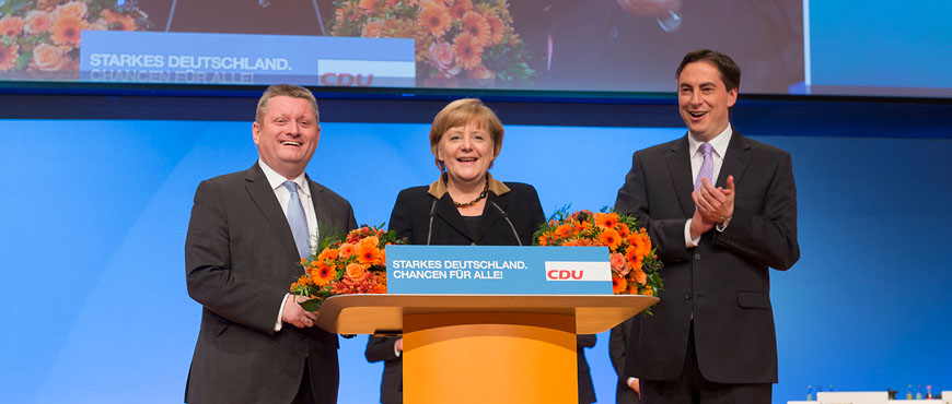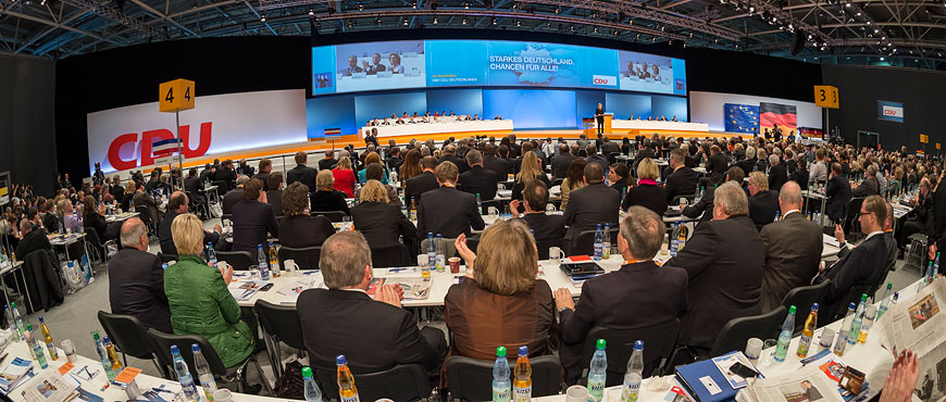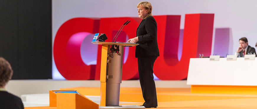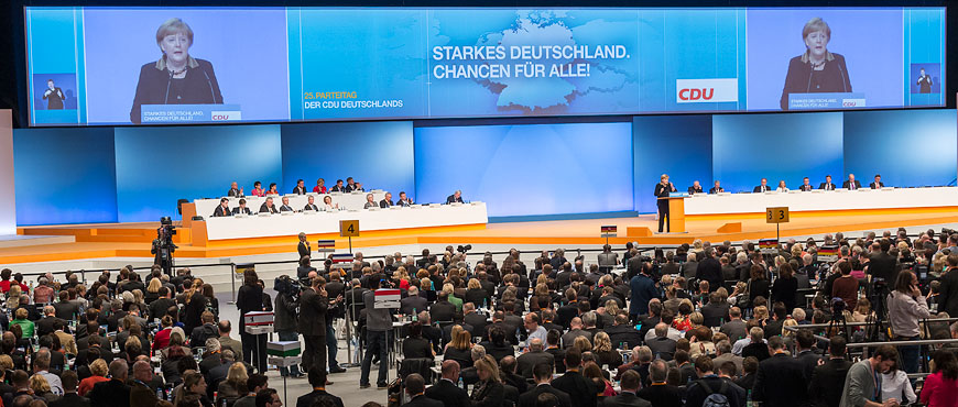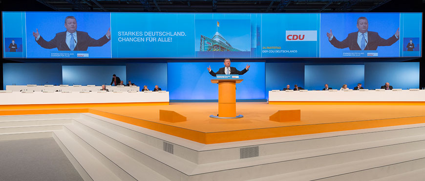 Creative Director Matthias Kaminsky was assigned to conceive and implement two party conferences for Germany’s CDU political party. Both the design of the stage as well as the development of the media and film content were placed in his sphere of responsibility. A temporary seat of government, from where political leaders would be able to act immediately in the event of an emergency, was constructed behind the stage to the highest technical standards and given the name “Angie Village”. With moving images and logistic planning, Matthias also accompanied the political party during its election campaign.