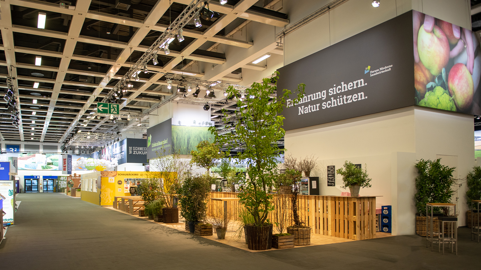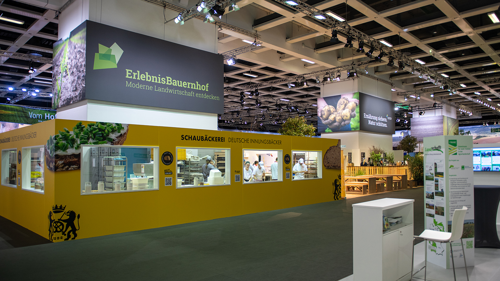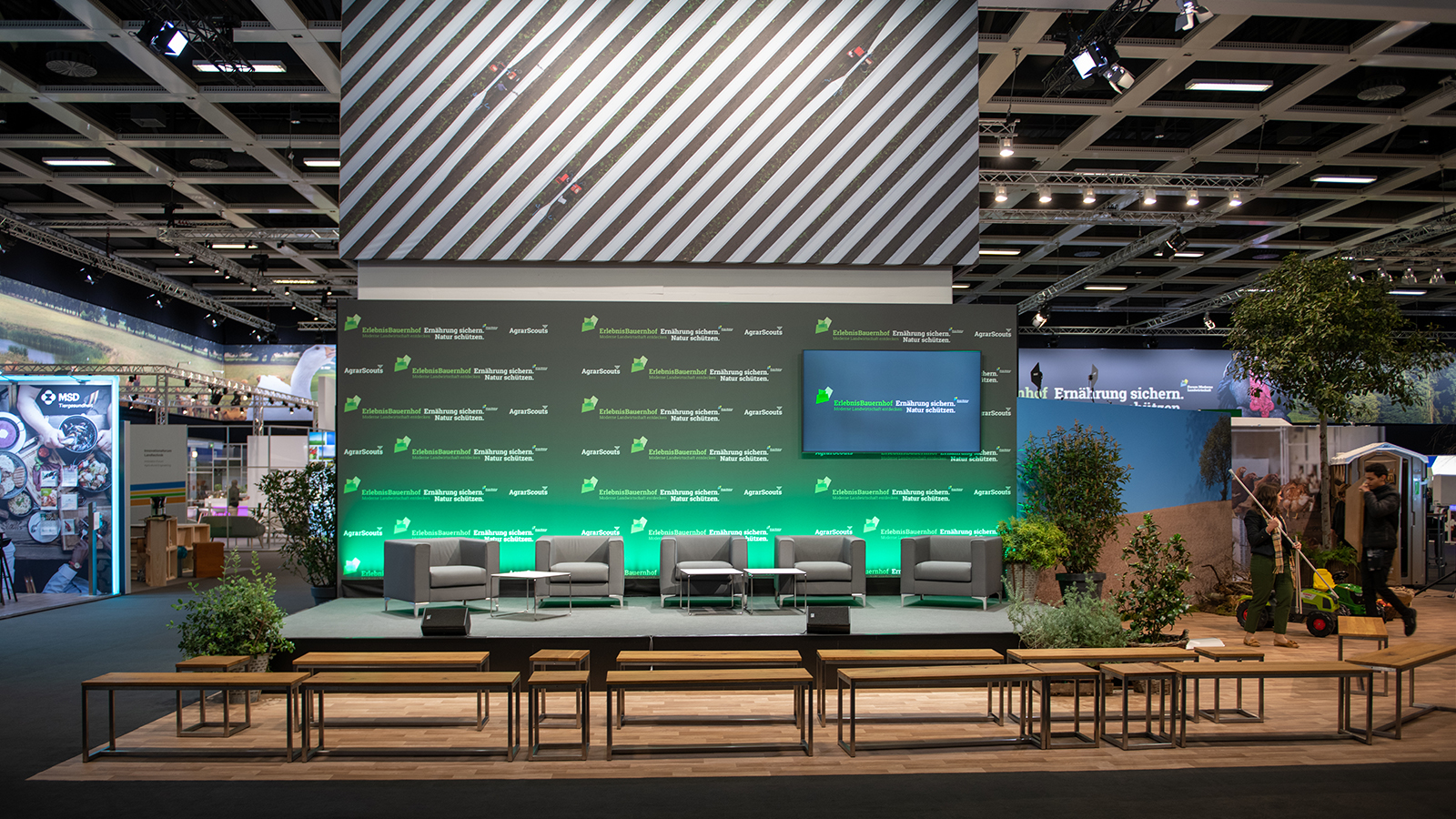 Auf der Internationalen Grünen Woche Berlin soll den Besucher*innen und der Politik die konventionelle Landwirtschaft in Deutschland vermittelt und nahegebracht werden. Beim Entwurf des kompletten Messestands in Hallengröße lag das Augenmerk auf moderner und barrierefreier Vermittlung der Inhalte für heterogene Altersgruppen. Alle Elemente des Messestands wurden als 3D-Renderings erzeugt, Infotainment-Elemente wie Traktorsimulator und virtueller Melkstand konzipiert.