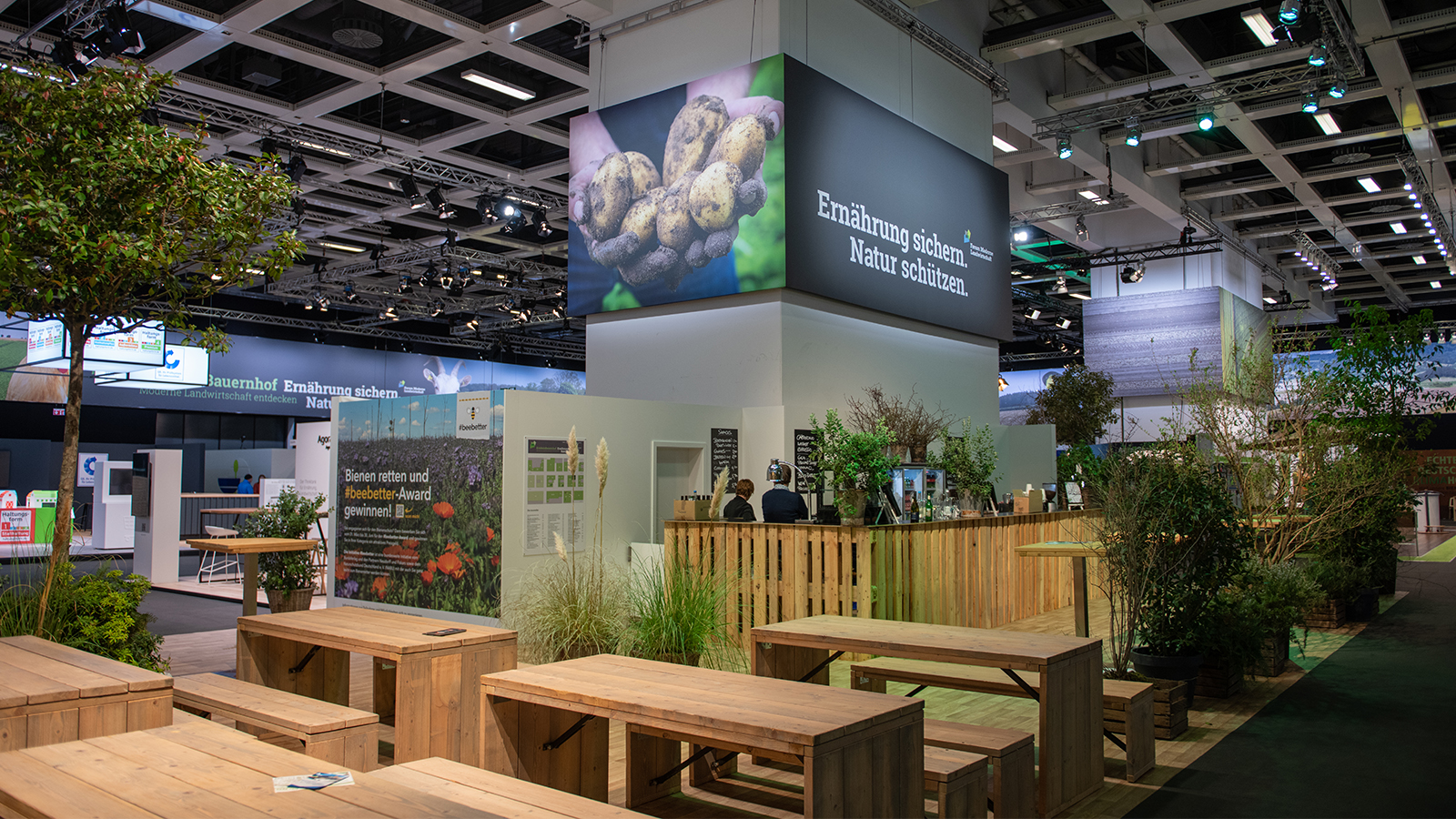 Auf der Internationalen Grünen Woche Berlin soll den Besucher*innen und der Politik die konventionelle Landwirtschaft in Deutschland vermittelt und nahegebracht werden. Beim Entwurf des kompletten Messestands in Hallengröße lag das Augenmerk auf moderner und barrierefreier Vermittlung der Inhalte für heterogene Altersgruppen. Alle Elemente des Messestands wurden als 3D-Renderings erzeugt, Infotainment-Elemente wie Traktorsimulator und virtueller Melkstand konzipiert.